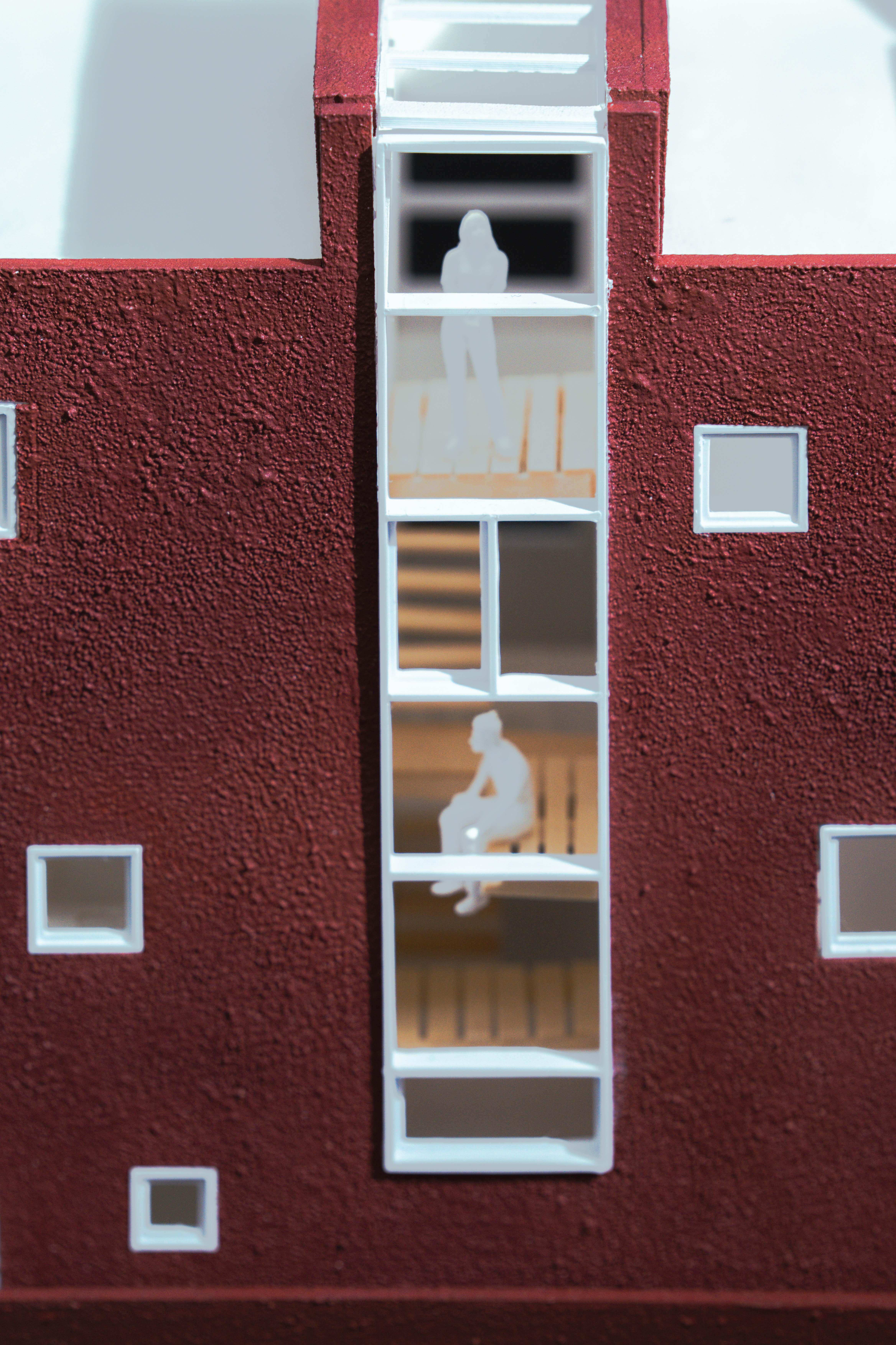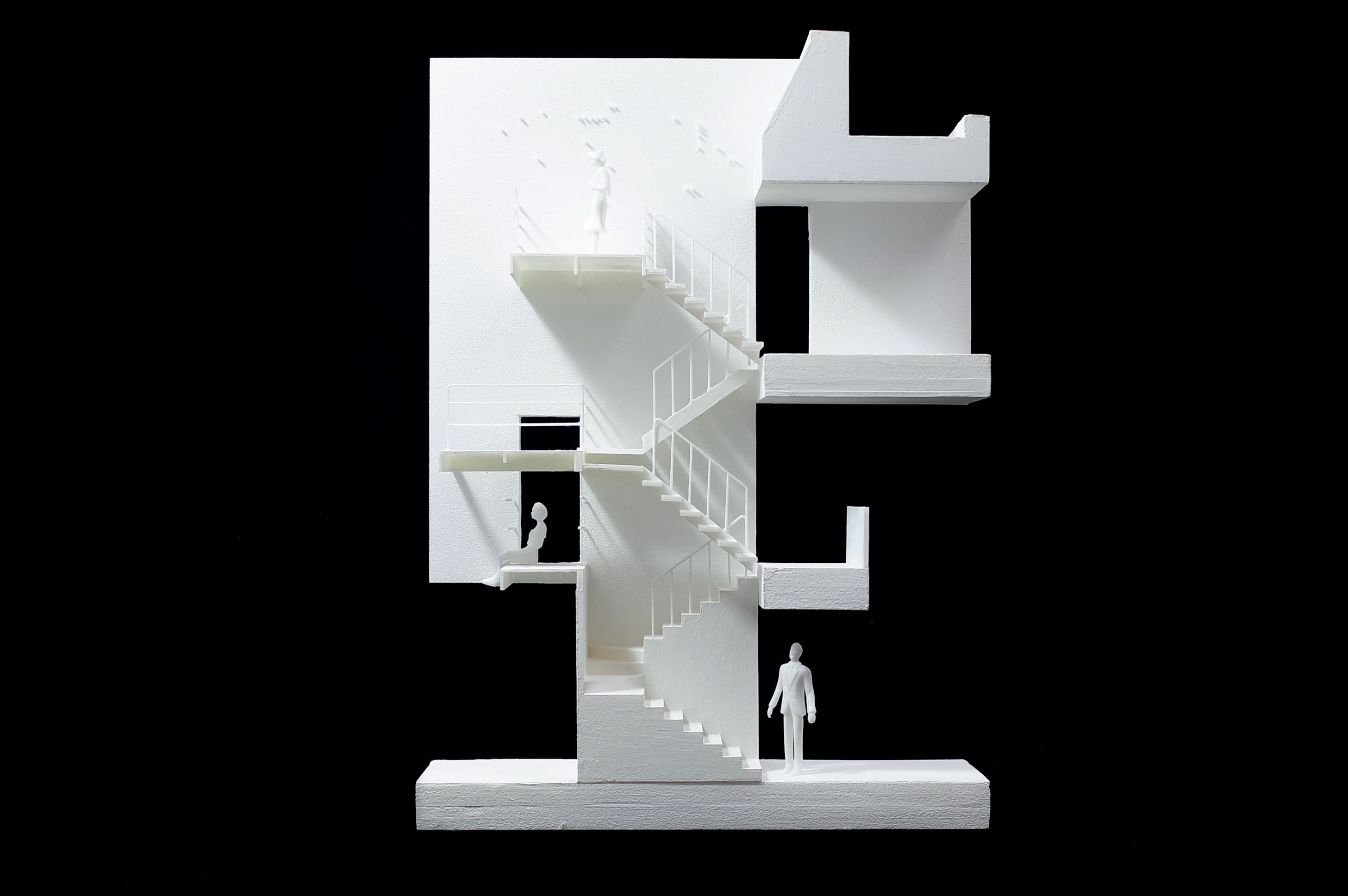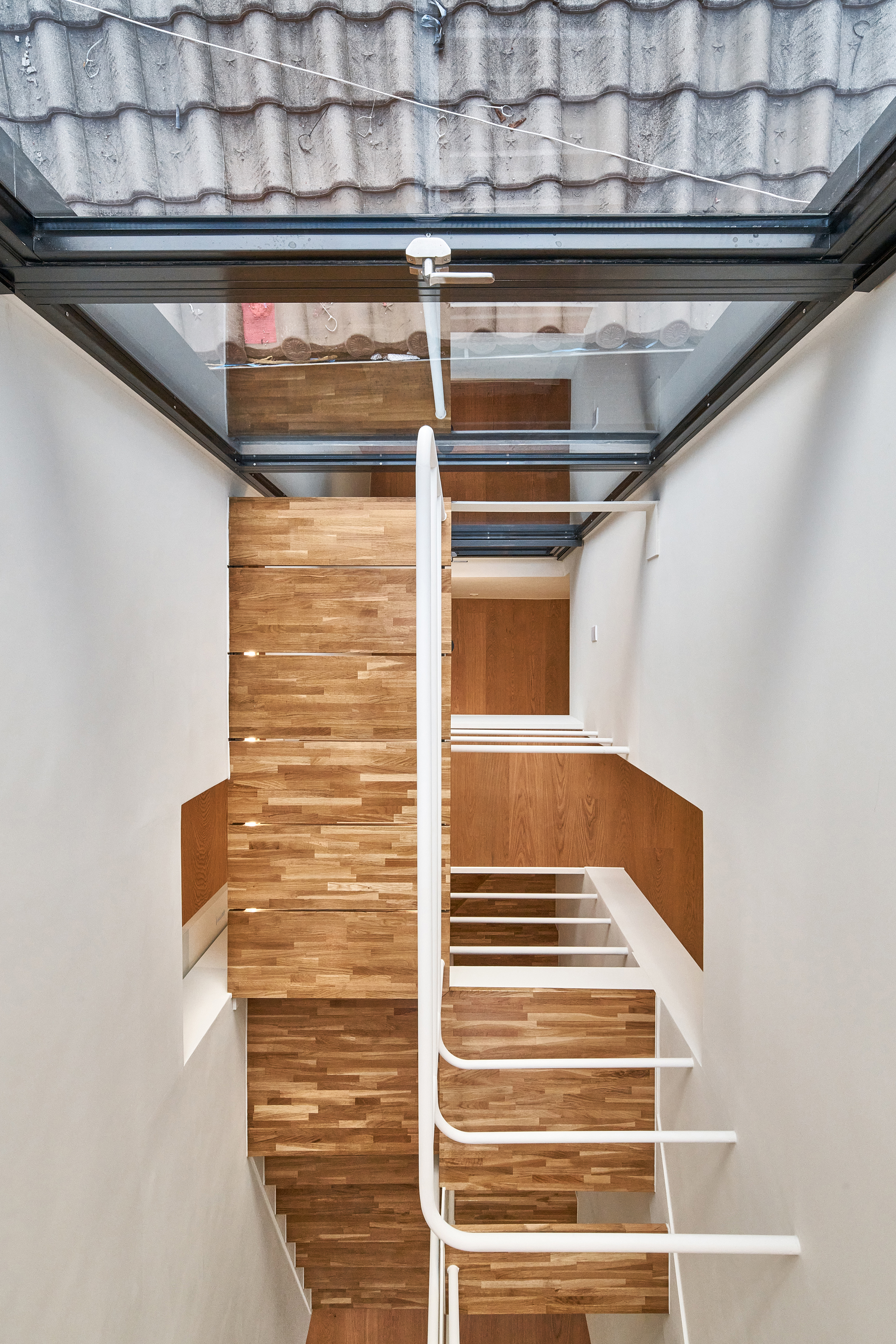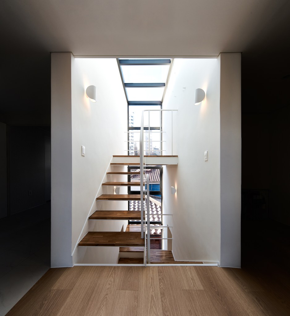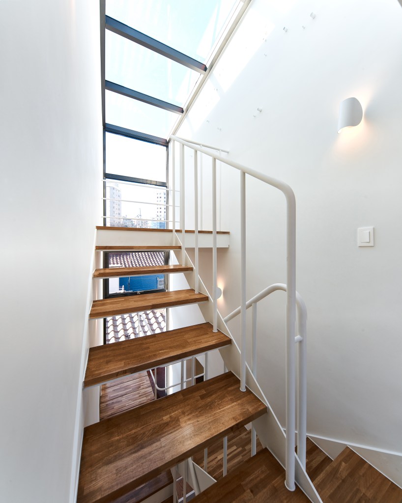 집의 중앙을 수직으로 관통하는 계단, 단단하게 집을 지탱하는 두 벽 사이를 오르고 내린다.