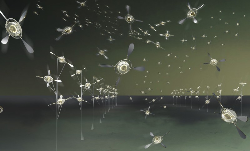 “Drift Light” refers interacting light system floating in the urban area. They are scattered in cities with the form of street lighting, where each quad-copter shaped light is docked. They receive and transmit information like weather condition and people’s behavior by changing brightness and patterns of the flock. Especially in urban area based on functional needs of urban light, they transmit information about various issues. At the same time, they react each other like swarm intelligence making spectacular lighting scene to people.