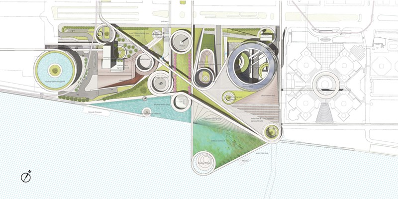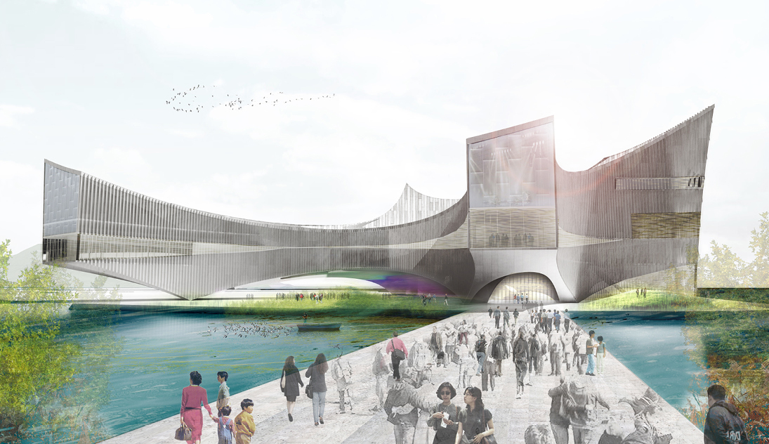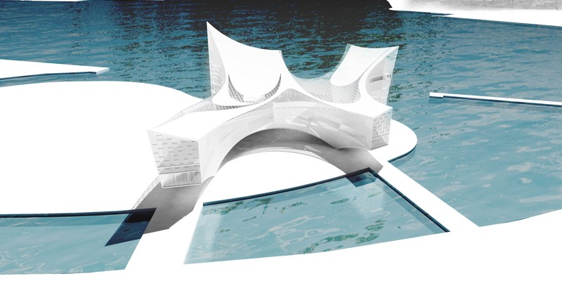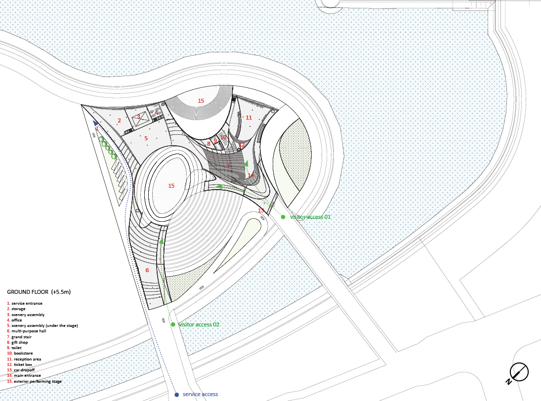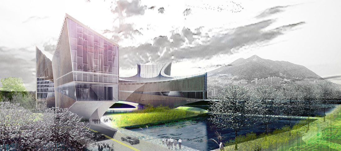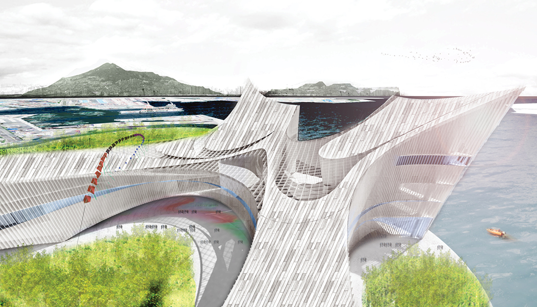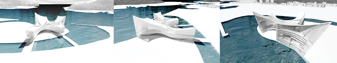 This project is started from the critique on the formation of artificial land on the sea. When people reclaim land from the sea, they take earth from other place and pile them up, but the proposed building takes a reversed strategy to erode away the volume of the site on the contrary to the way they build up the artificial land. There are two main accesses from the bridges connecting the site to the land. Like wind erodes earth or stone by making its own wind way, two main accesses cross each other to make a network and main circulation on the site, and then the site starts to be eroded from the boundary by its force.