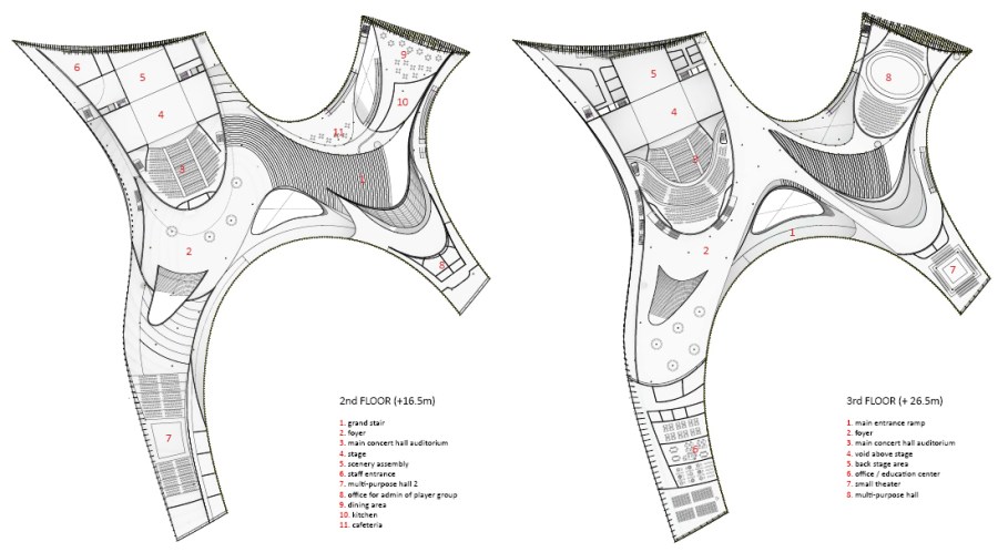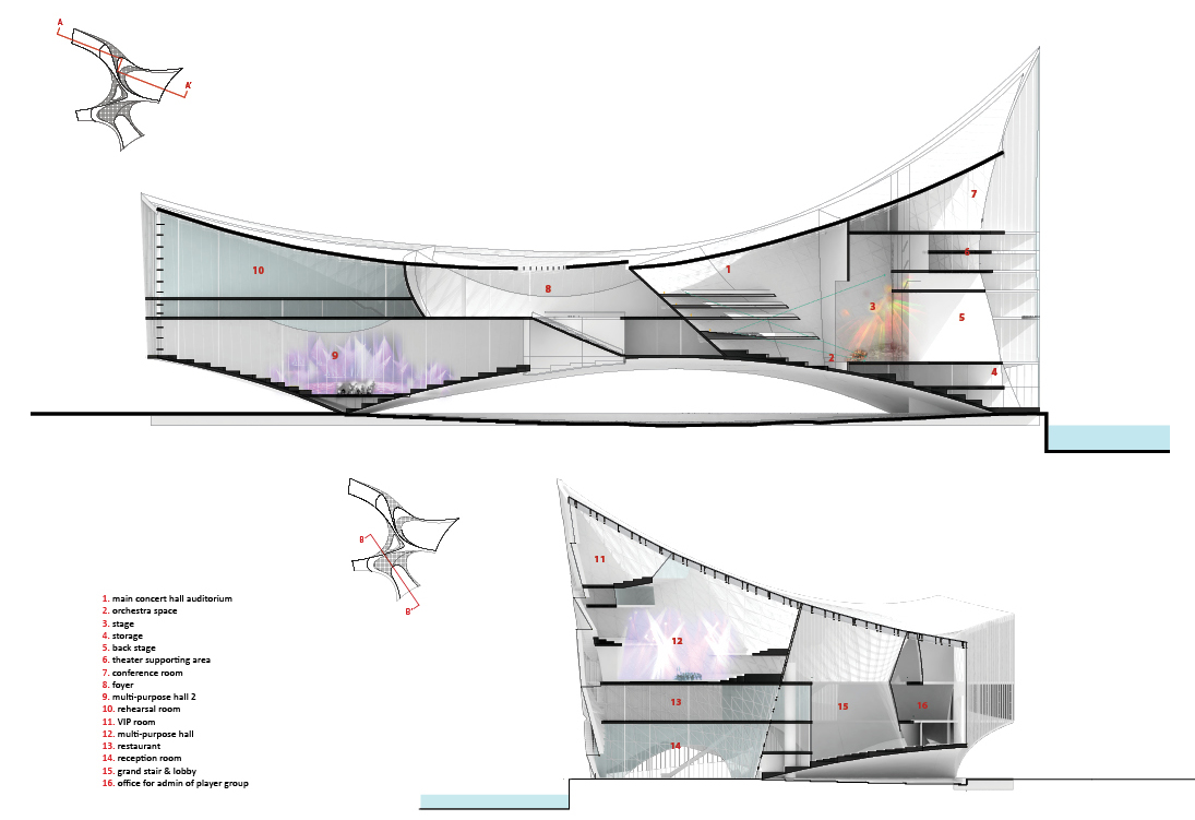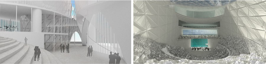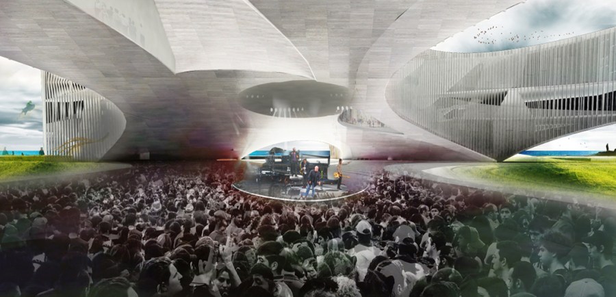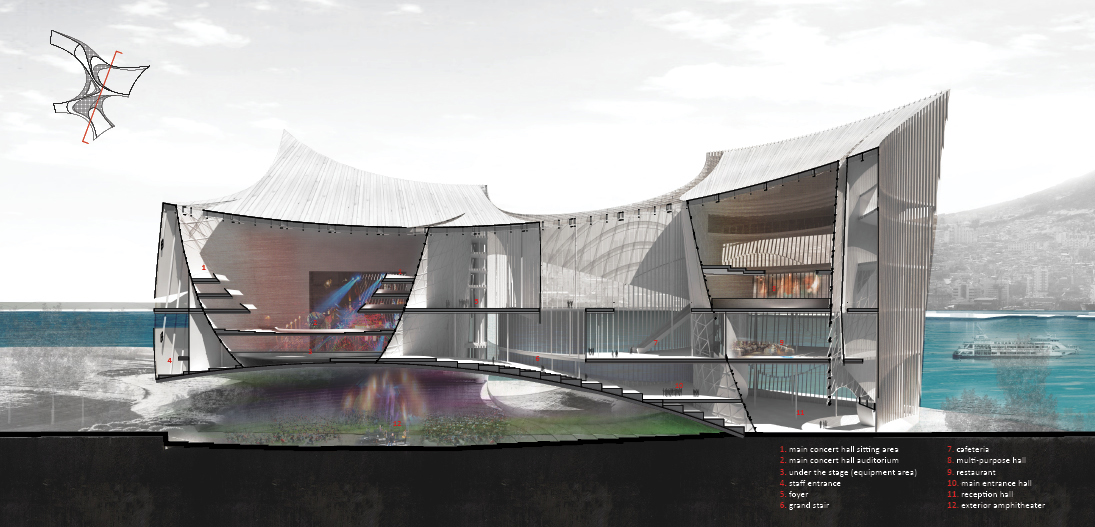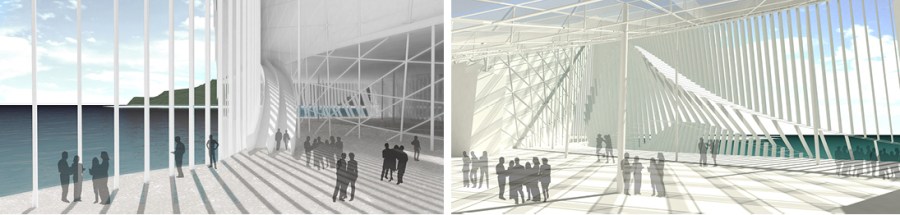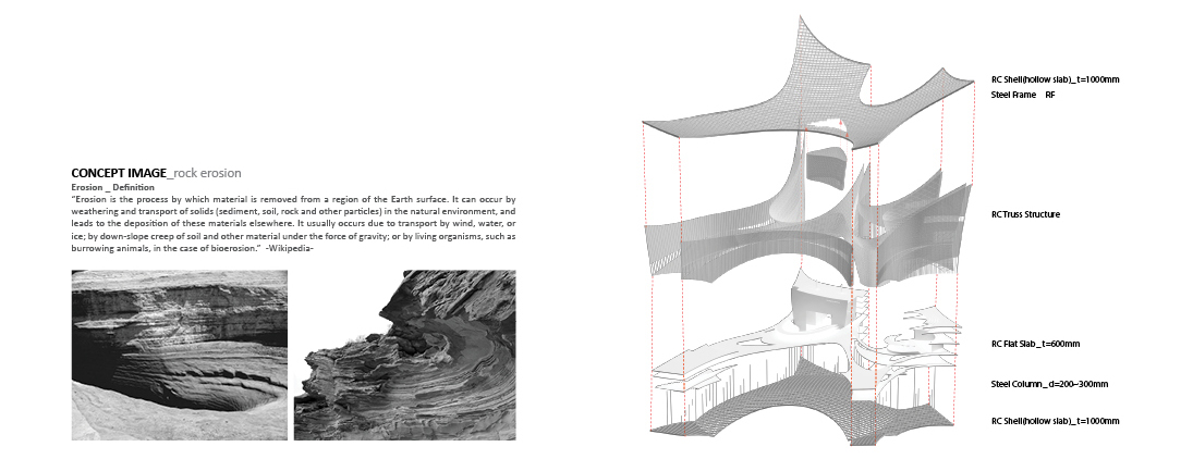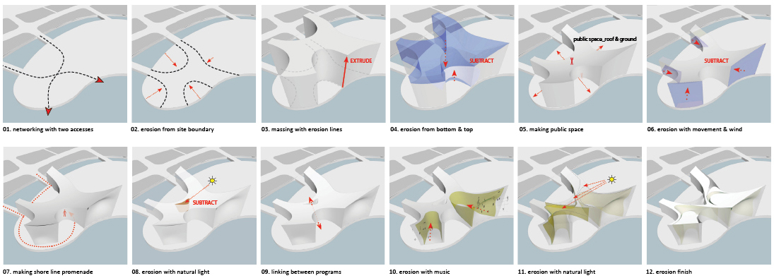 The volume extruded from the erosion line is encroached on its bottom and upside making public space and shoreline promenade, which provides visitors with open views toward the sea and city. The erosion process continues inside the volume to enable the sunlight get in and make a linkage between the programs which are distributed inside and outside. Two main concert halls facing the sea are also formed by the process of erosion like the tide of the sea floods toward the land. Natural erosion is always ongoing process by weathering and living organisms in the natural environment. The artificial erosion tactics also process continuously with the change of time and climate.