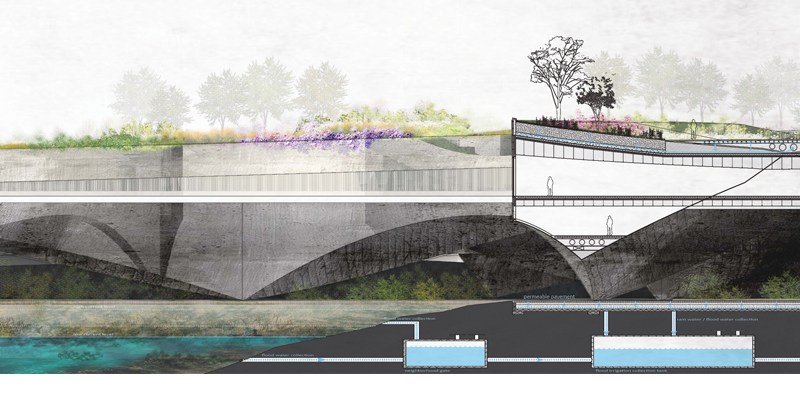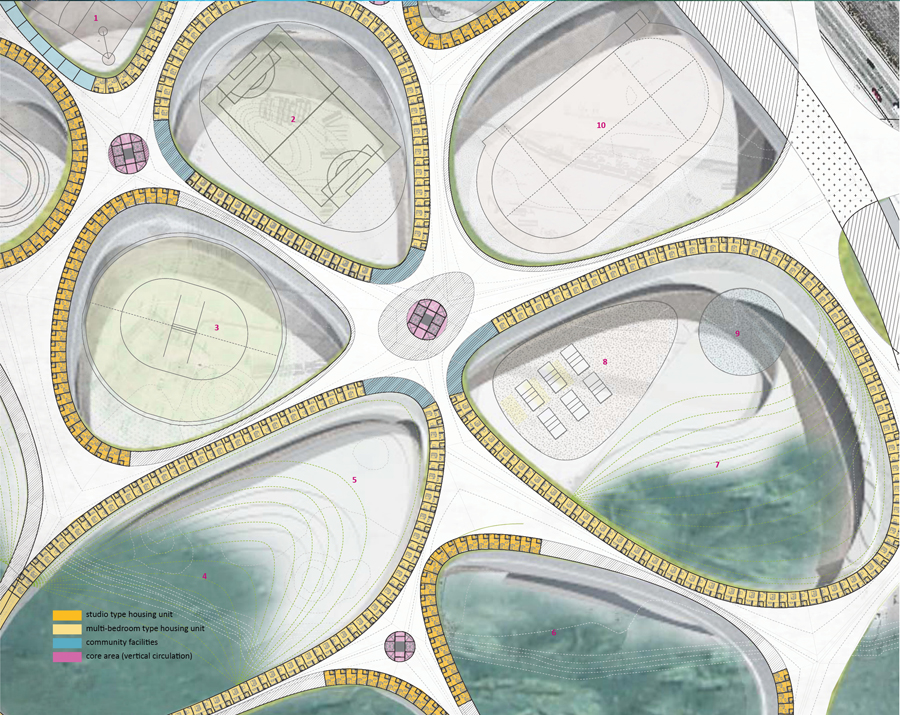 Elevated porous infrastructure creates meandering pedestrian path and it provides nested ring-like roof gardens. Sloped green roof collects rainwater into the central pipe under the roof and it is connected to underground water tanks. By adding this mega structure over the porous mass-system on the ground level, people can experience different movements and perspectives. There are housing and community facilities within the elevated porous structure. In terms of program, this elevated horizontal mega housing type will be a radical solution in response to the population growth in this city. People can access their housing from the roof level which provides dynamic views from the site to around area. Moreover, the roof garden provides new ground for future development as a elevated secondary ground for nested high-rise towers inside the elevated porous structure.