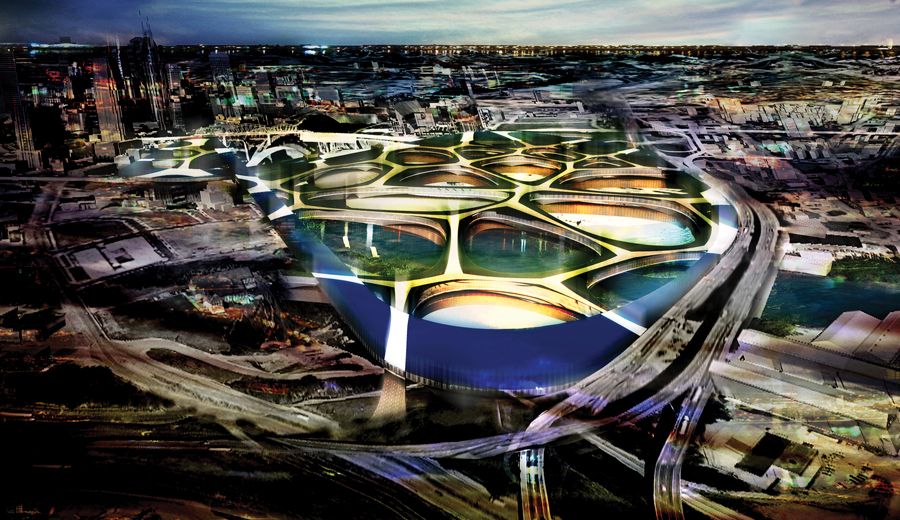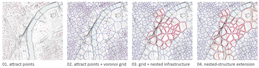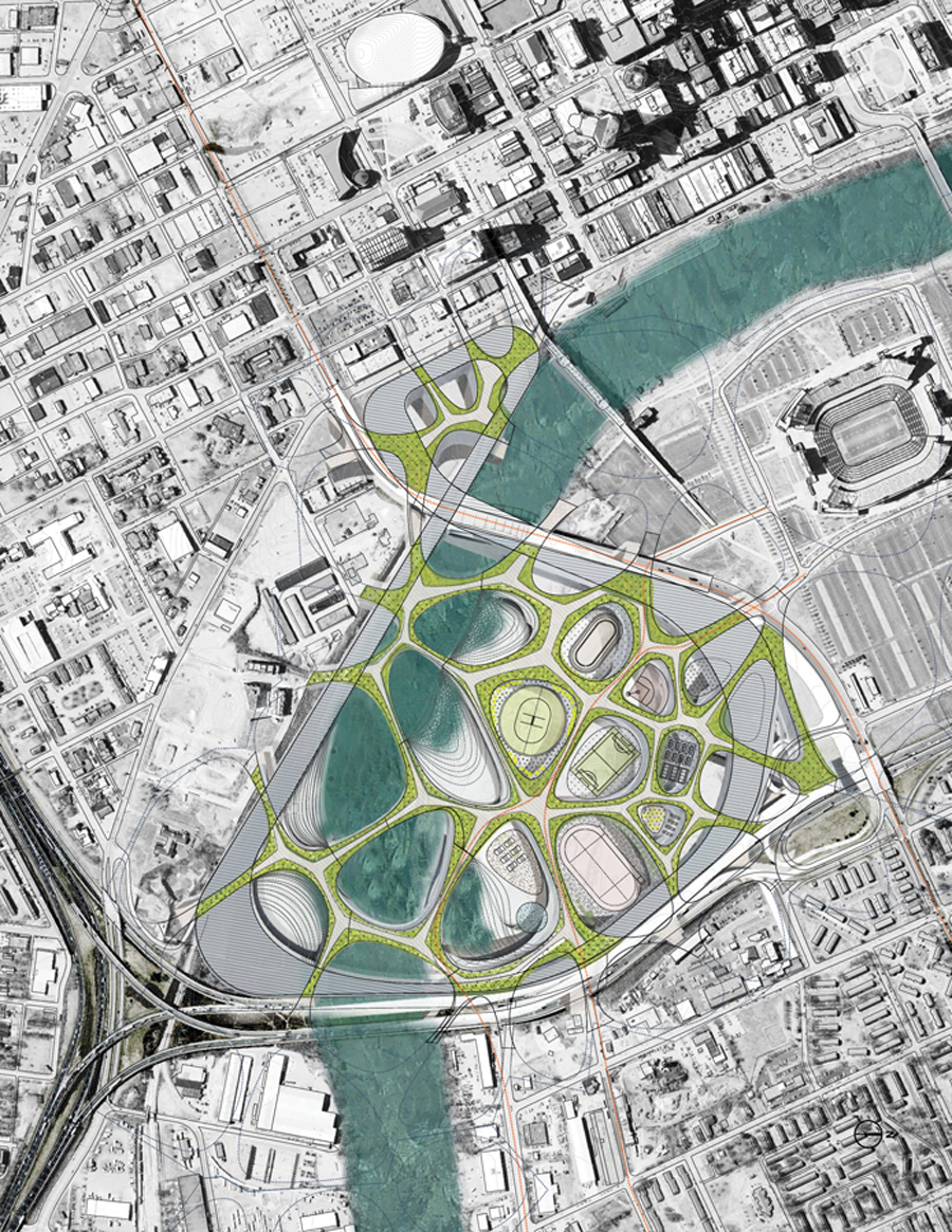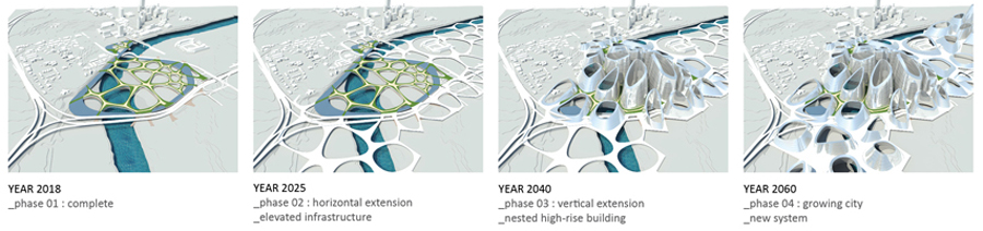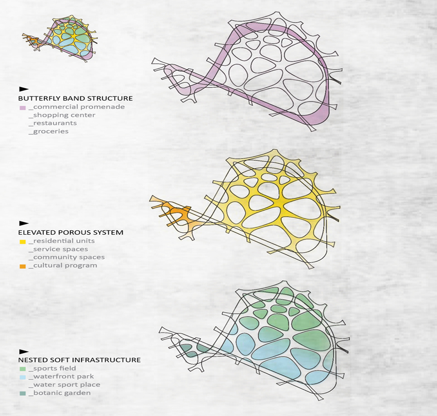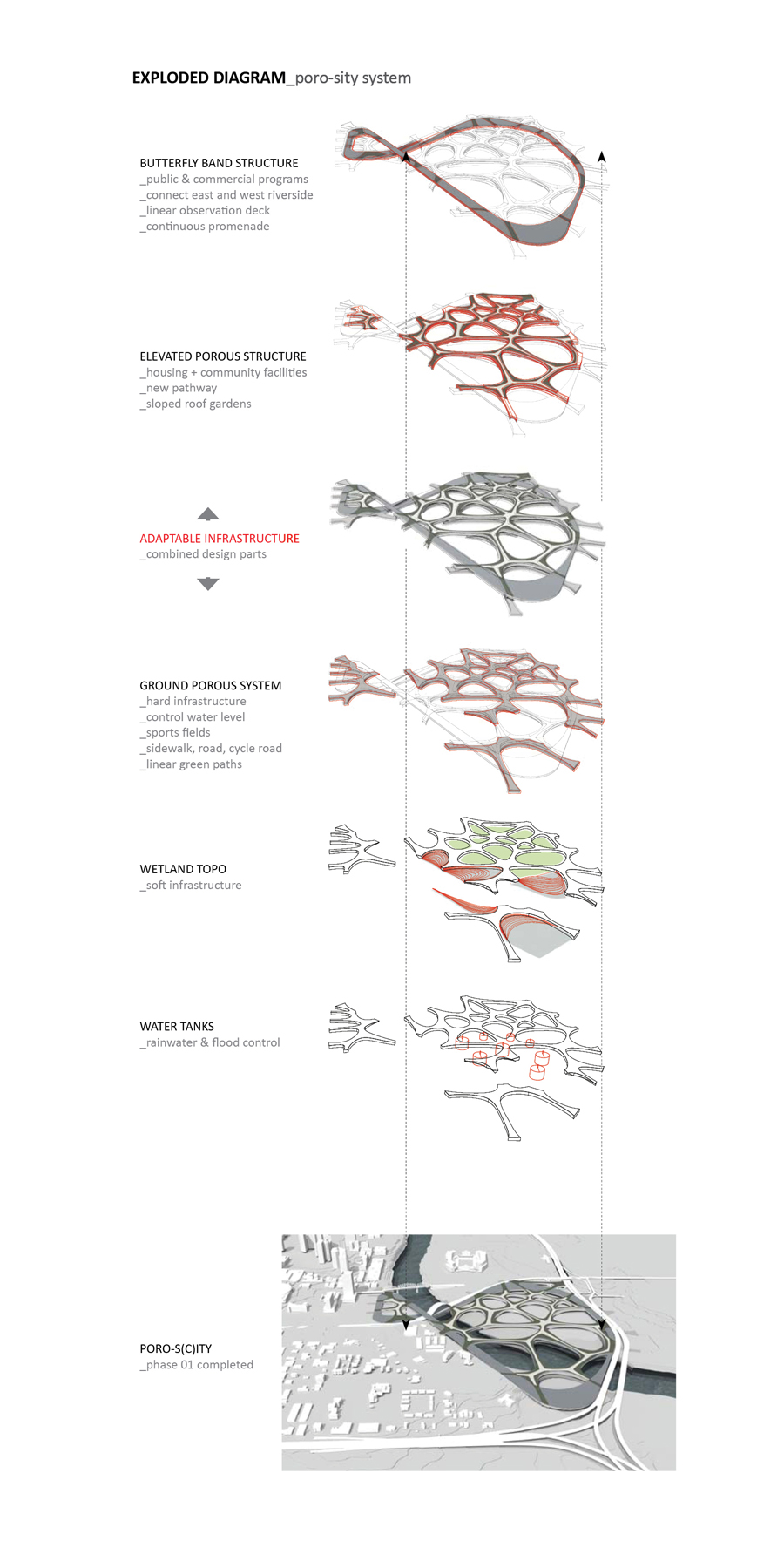 Poro-C(s)ity is flexible and adaptable infrastructure providing multiple ground. It is integrated system with water controlling facilities, housing and its supporting programs as well as sports fields, and complex public programs within the circulating butterfly like band structure. The project is developed base on voronoi grid system which is highly flexible compared to the conventional rigid grid. The system interacts with the existing rigid grid and building blocks and provides elevated new ground for future development in response to the population growth and urban density. By combining hard and soft infrastructure within the one hybrid mega-structure, it controls various ecological problems resulted from global climate change, rising current and flooding.