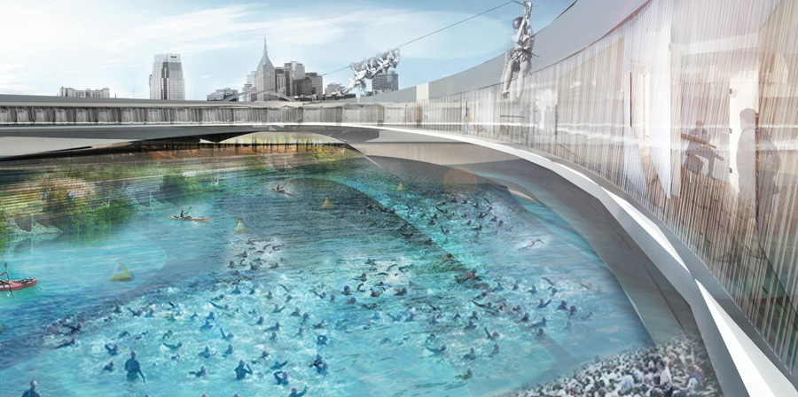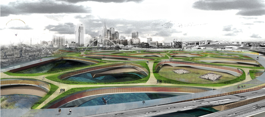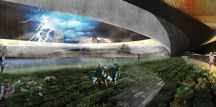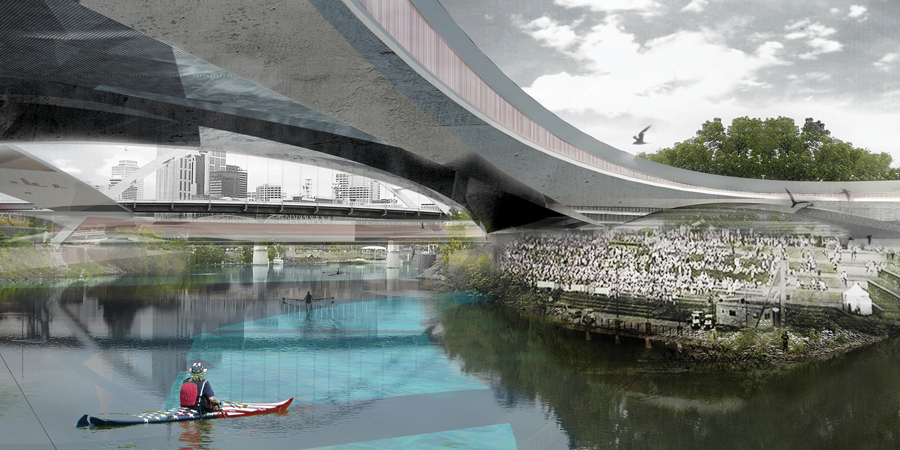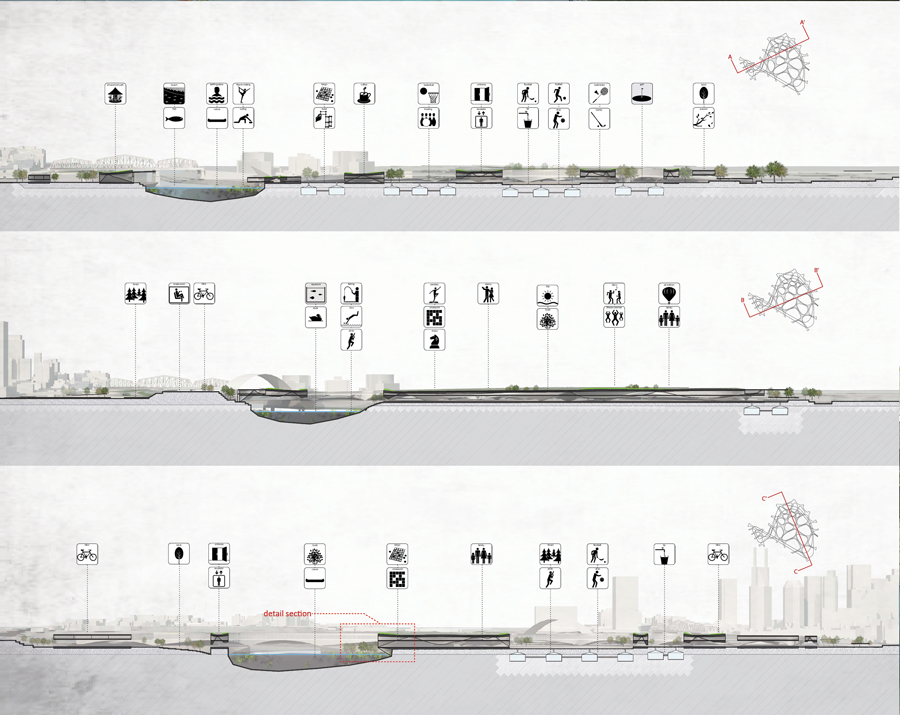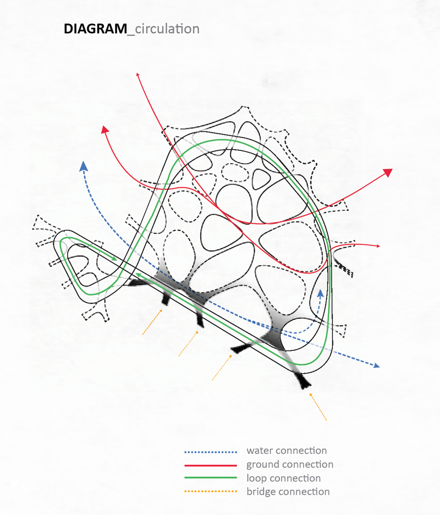 Linear band structure circulates around the site and provides continuous path. While moving along the existing urban infrastructure like highway, bridges, and interchange, it connects the site to the center city and the bank area and enhances connectivity throughout the site and its neighbor. There are residential supporting programs like shopping mall, retail stores, observation space and restaurants in this band structure.