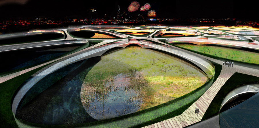 Our strategy is creating hybrid infrastructure which is combined hard infrastructure with soft infrastructure such as waterfront wetland. Porous mass-system on the ground level functions as a hard infrastructure for roads, cycle paths, sidewalk, and edge green paths. The green path on the edge purifies rain water as well as gray water from elevated programs like housing, and shopping mall. And the Porous mass-system is transformed into piers near the water front. It limits the water level and controls flood. Topography around water edge moves gradually toward the river to recover the relationship between people and water. Wetland is embedded between the pier structures as a soft infrastructure. Various sports fields like football field, cycle track, and running track are nested inside of the holes with different size. Water tanks which can reserve rain water and control flooding are installed under the sport fields.