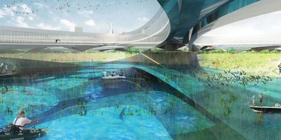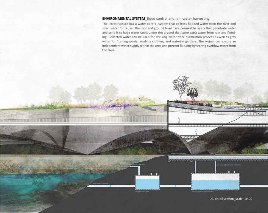 The infrastructure has a water control system that collects flooded water from the river and stromwater for reuse. The roof and ground level have permeable layers that penetrate water and send it to huge water tanks under the ground that store extra water from rain and flooding. Collected water can be used for drinking water after purification process as well as gray water for flushing toilets, washing clothing, and watering gardens. The system can ensure an independent water supply within the area and prevent flooding by storing overflow water from the river.