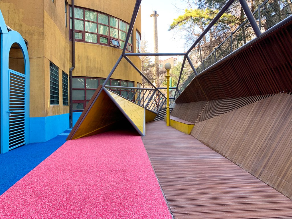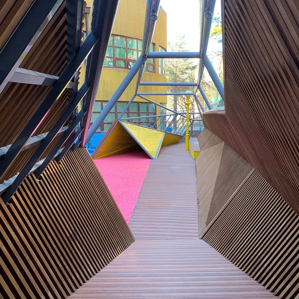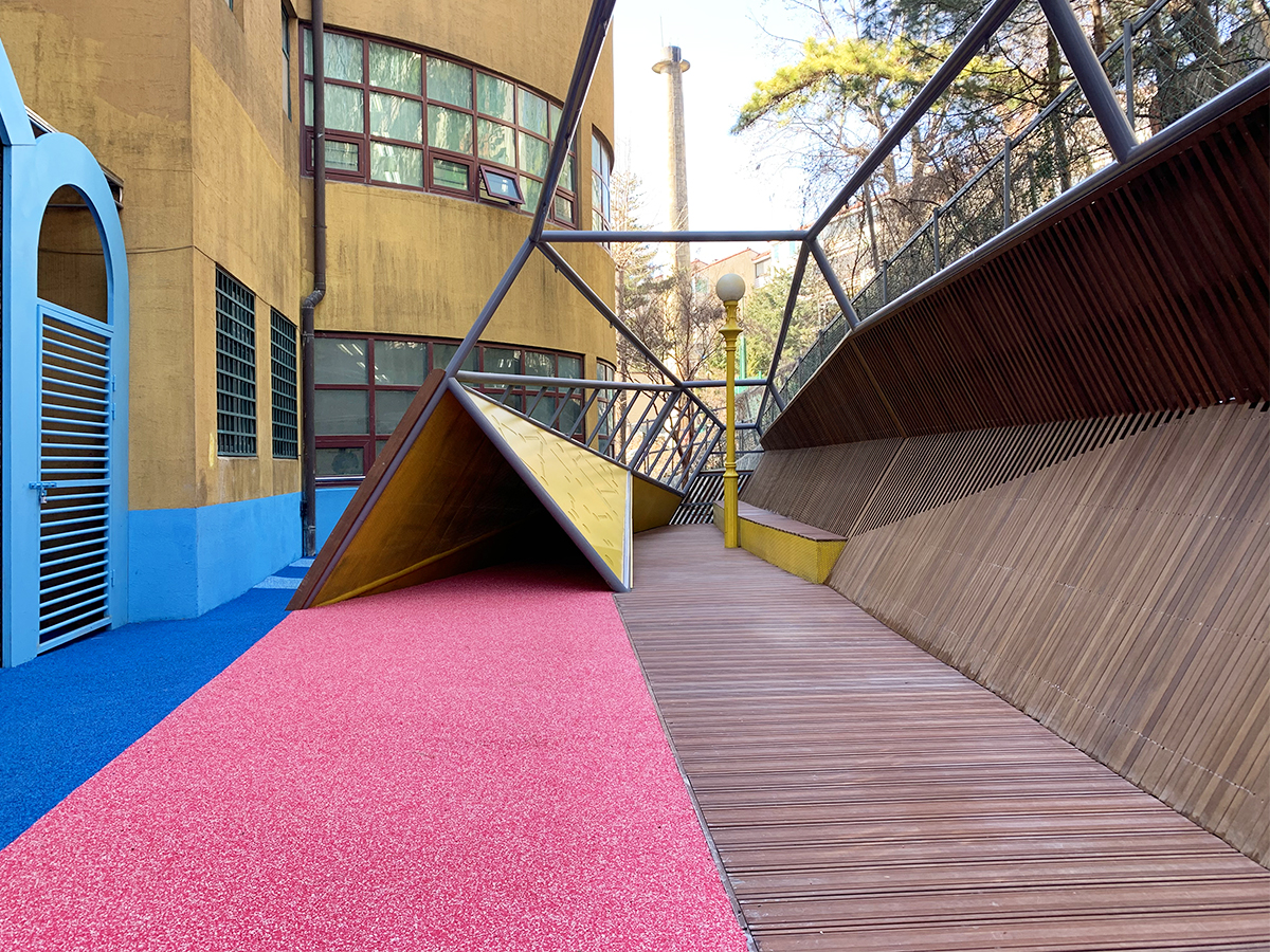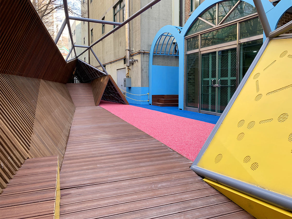 아이들은 지속적으로 오르고 내리고 몸을 움직이며 놓여진 공간의 경계 사이에서 끝임없이 시선을 교환하며 놀이한다.